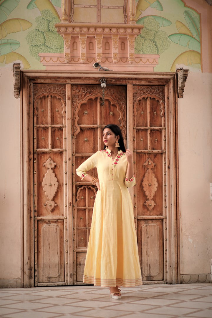 Lemon Yellow anarkali with intricate hand embroidery on neckline and sleeve hem is perfect for day event or get togethers.